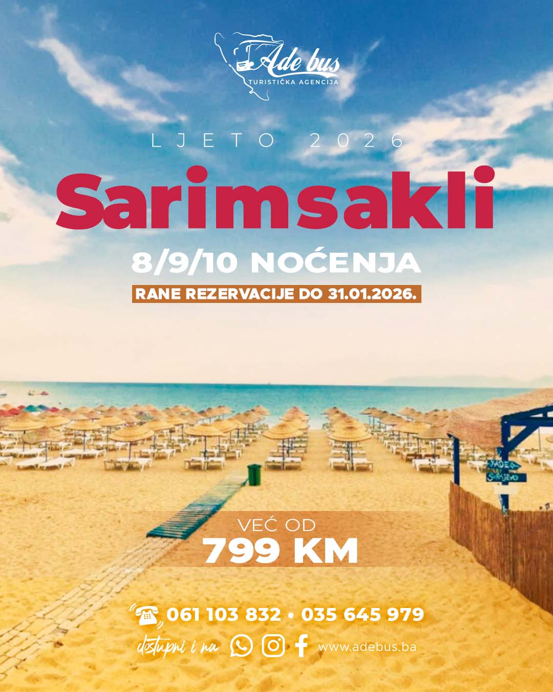 - 8, 9 ili 10 noćenja po izboru datuma polaska u cjenovniku i na bazi izabrane usluge u hotelu po izboru u Sarimsakliju.